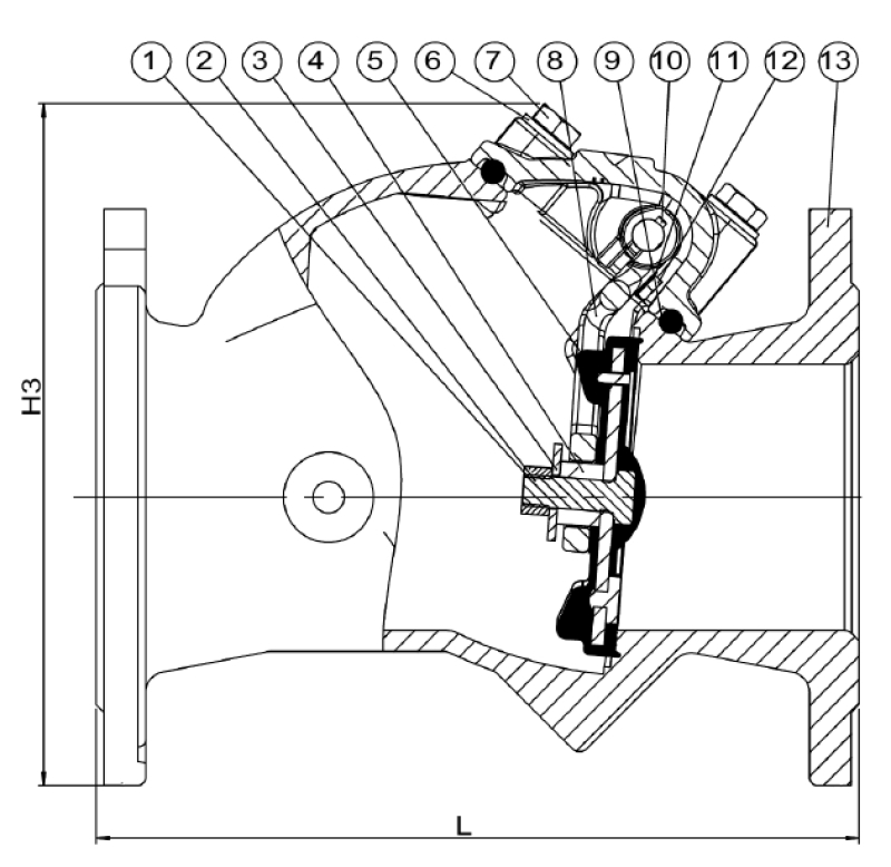 Axe libre pour permettre le montage d’un levier et d’un contrepoids ou un ressort pour assister la fermeture du clapet et éviter les coups de bélier