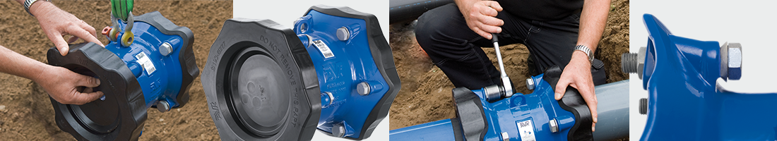 Le serrage s’effectue côté manchon pour faciliter le montage dans les tranchées étroites. Le filetage des boulons est protégé par un capuchon de protection permanent tout comme les écrous qui sont enfermés dans leur support et recouverts par la protection. Ils ne peuvent donc pas tomber lors du desserrage. Grâce au système SupGripTM, il n’est pas nécessaire de resserrer les boulons ultérieurement.